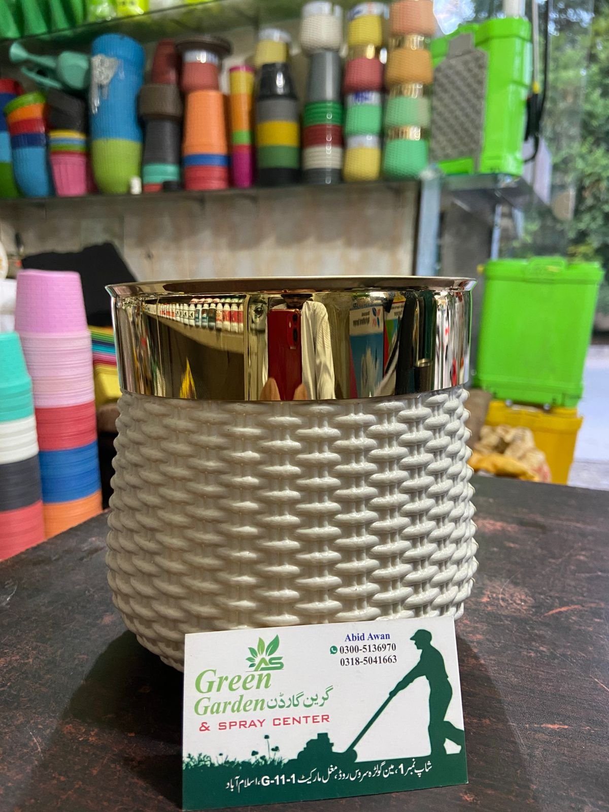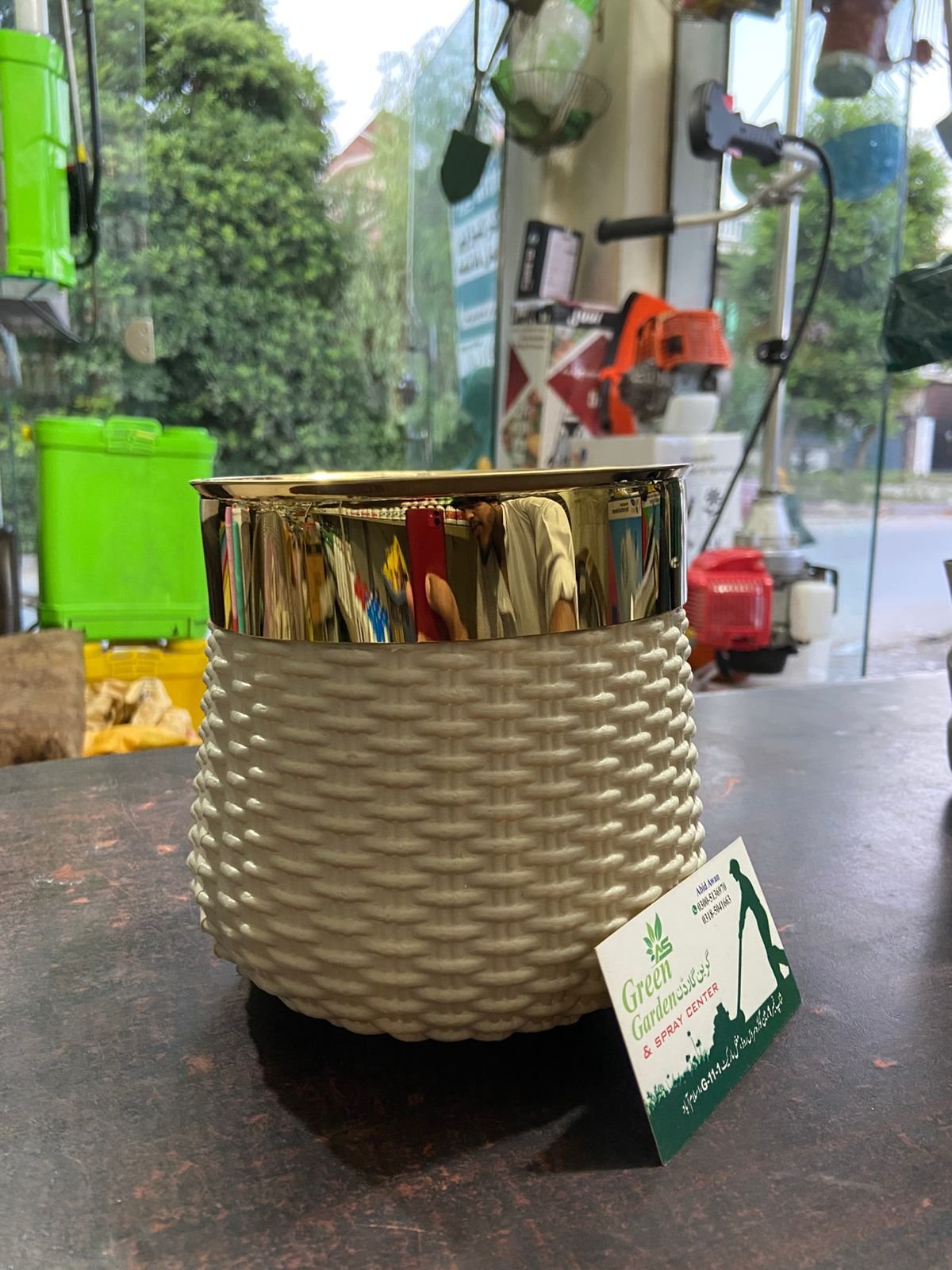 Design: The planter features a textured, often woven-like pattern on its body, and a distinct golden rim or collar at the top, adding an elegant touch.